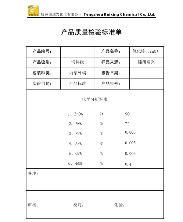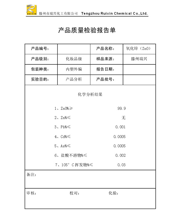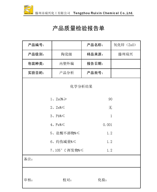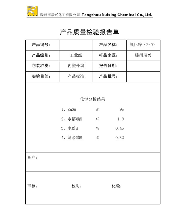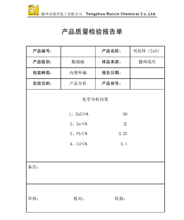 瑞興化工有限公司是生產(chǎn)氧化鋅的重點企業(yè),于2008年通過ISO9001:2008質(zhì)量管理體系認證?!叭鹋d”牌氧化鋅在國內(nèi)擁有較大穩(wěn)定的市場,并遠銷東南亞、中東、中南美等國家和地區(qū),在國內(nèi)外享有較高聲譽。